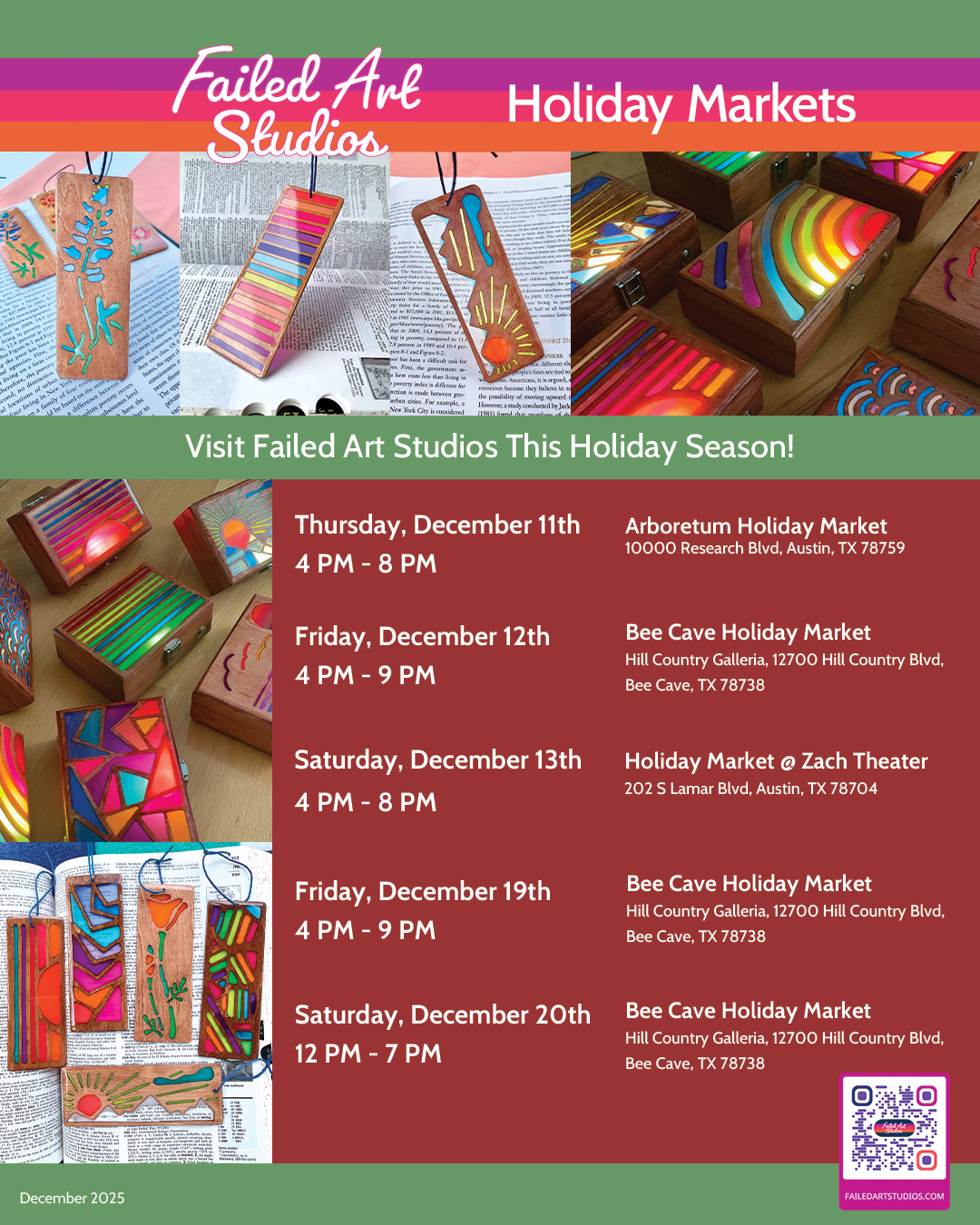 Visit Failed Art Studios This Holiday Season! The Market at Zach is a returning pop-up featuring Austin and Central Texas’ best local artisans and makers with drinks, performances, fun for...