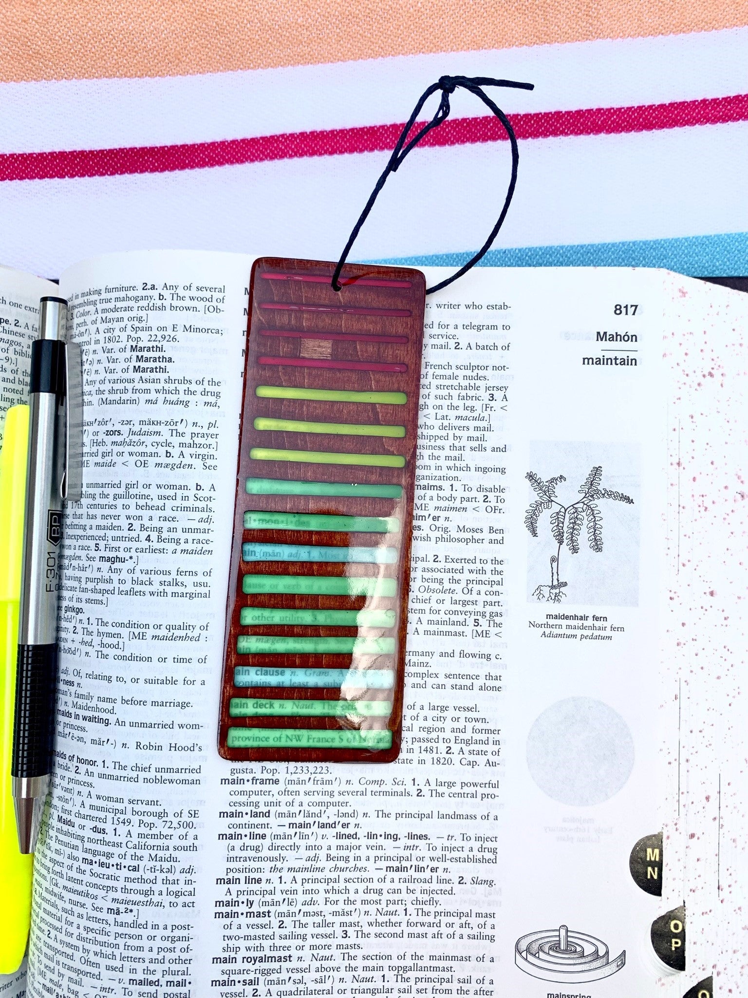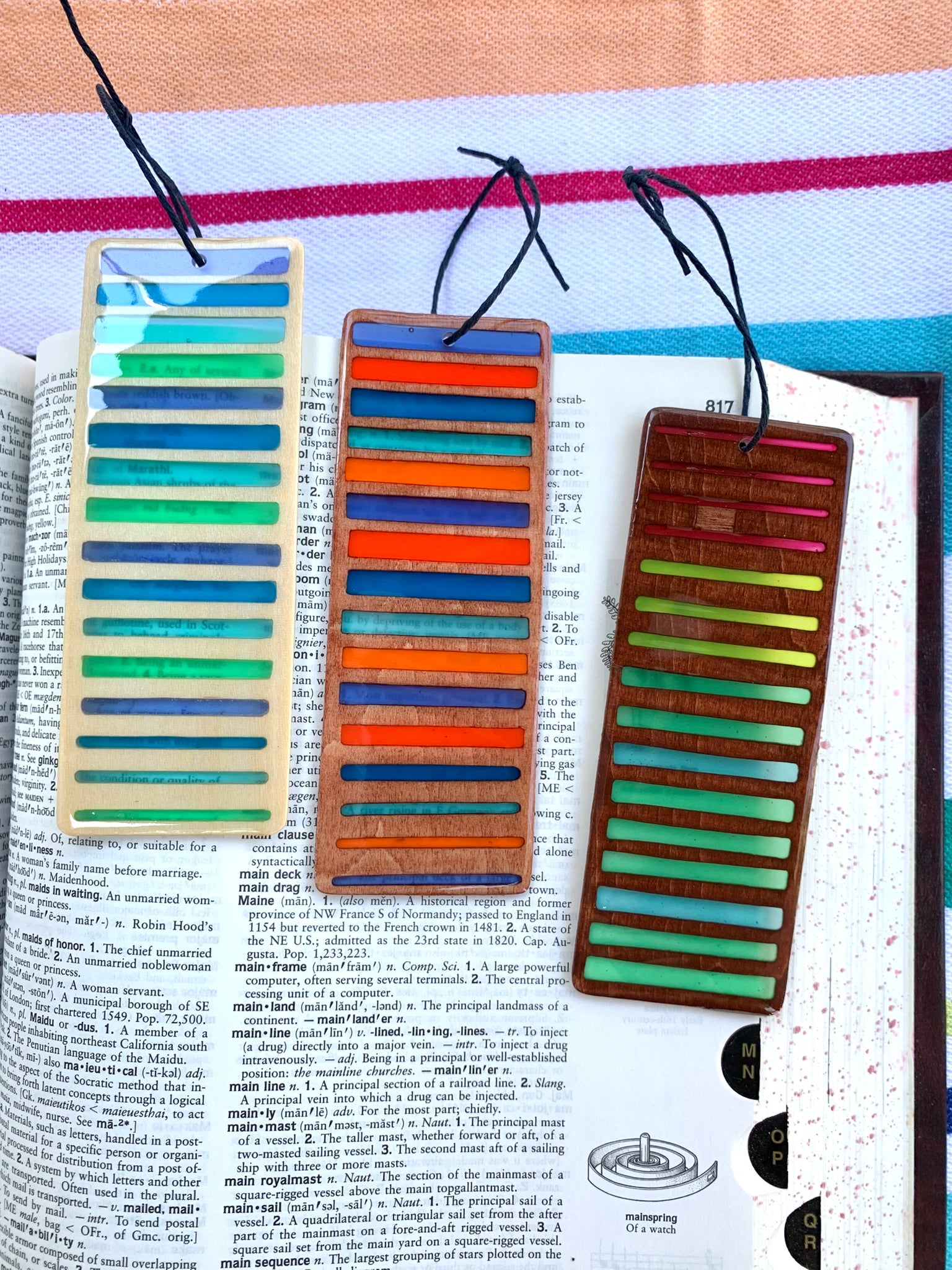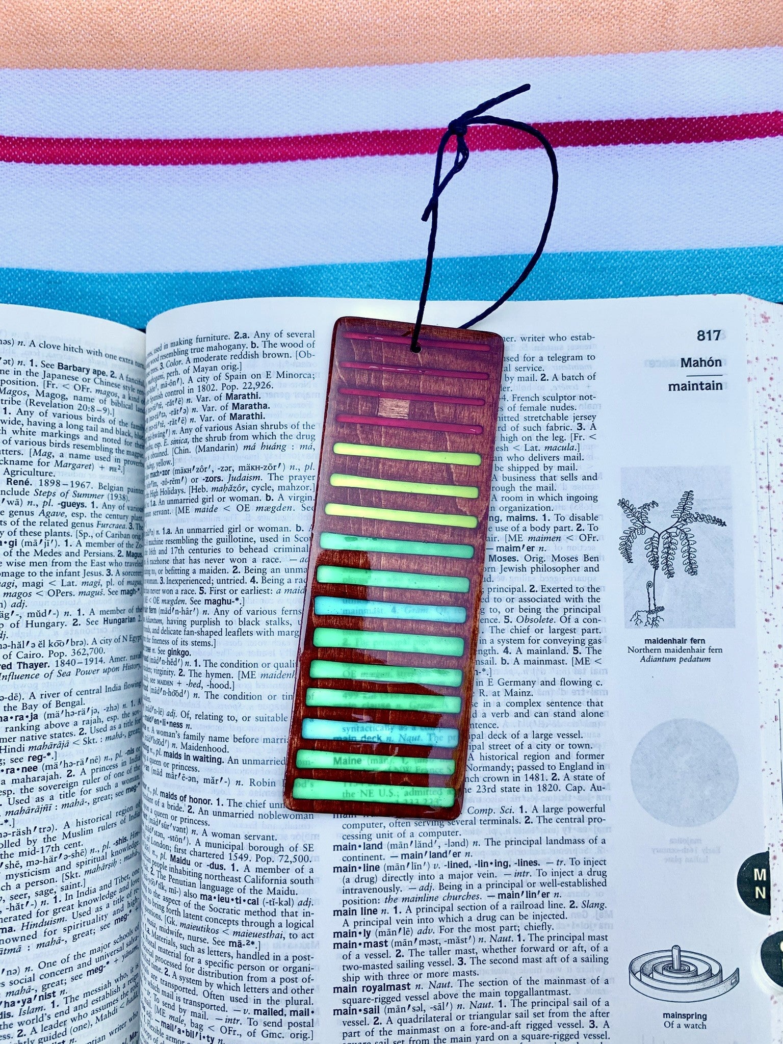 I cut the bookmarks from basswood sheets and stain them in different wood tones for a variety of color and grain highlights. I fill the designs with colorful UV resin, then give them a final clear coat of resin so they're extra sleek and robust. They have a simple blue hemp string tassel, leaving you with the option of adding any tassel if you would like.