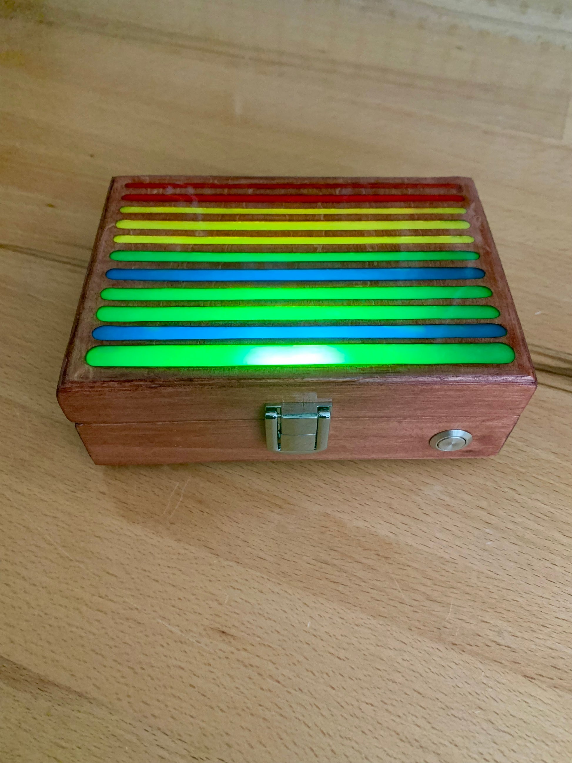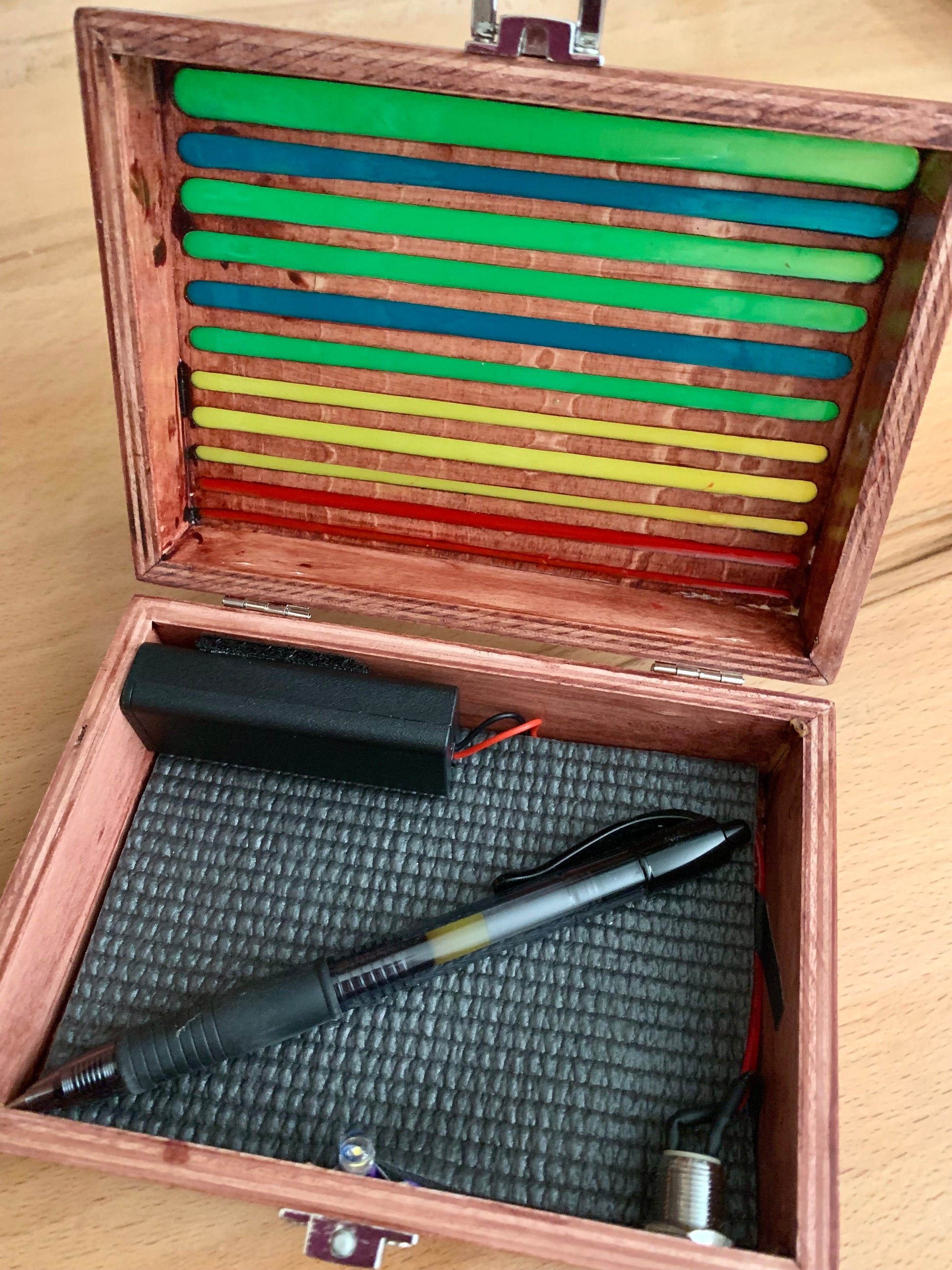 I cut each piece of the box from basswood with a table saw, then I hand cut each design into the lids using the same sunrise and sunset themes from my bookmarks. I wanted to bring the scenes to life with color and light, capturing the mood of each design in a new way. A small LED inside casts a soft glow, powered by two replaceable AAA batteries that lasts approximately 50 hours of continuous use.