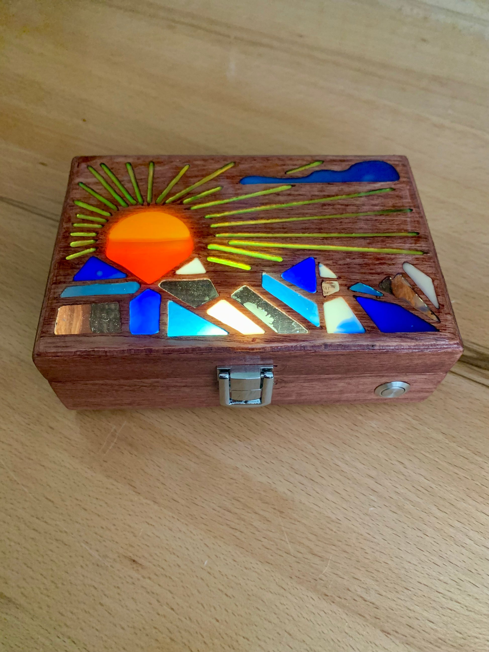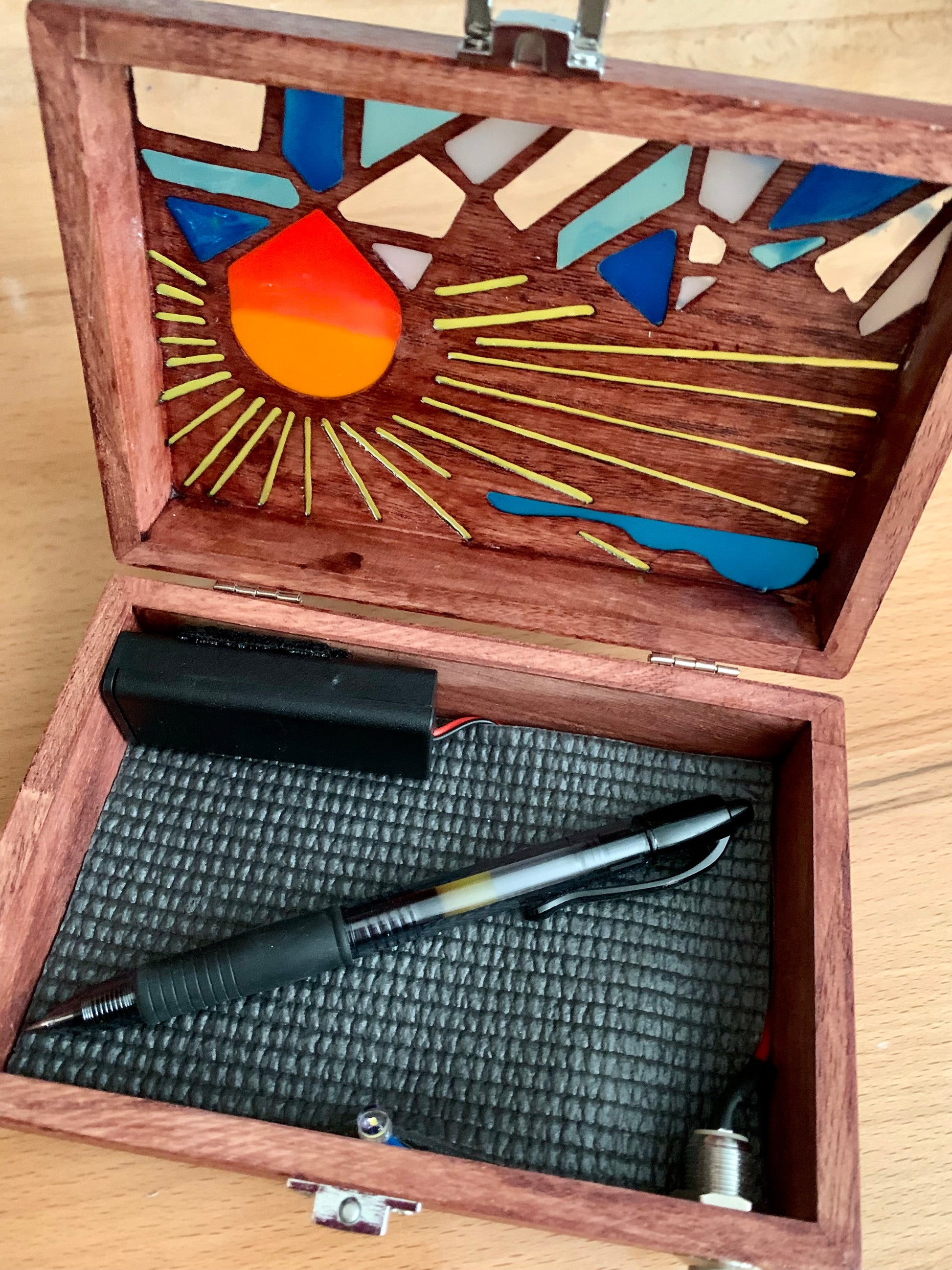 I cut each piece of the box from basswood with a table saw, then I hand cut each design into the lids using the same sunrise and sunset themes from my bookmarks. I wanted to bring the scenes to life with color and light, capturing the mood of each design in a new way. A small LED inside casts a soft glow, powered by two replaceable AAA batteries that lasts approximately 50 hours of continuous use.
