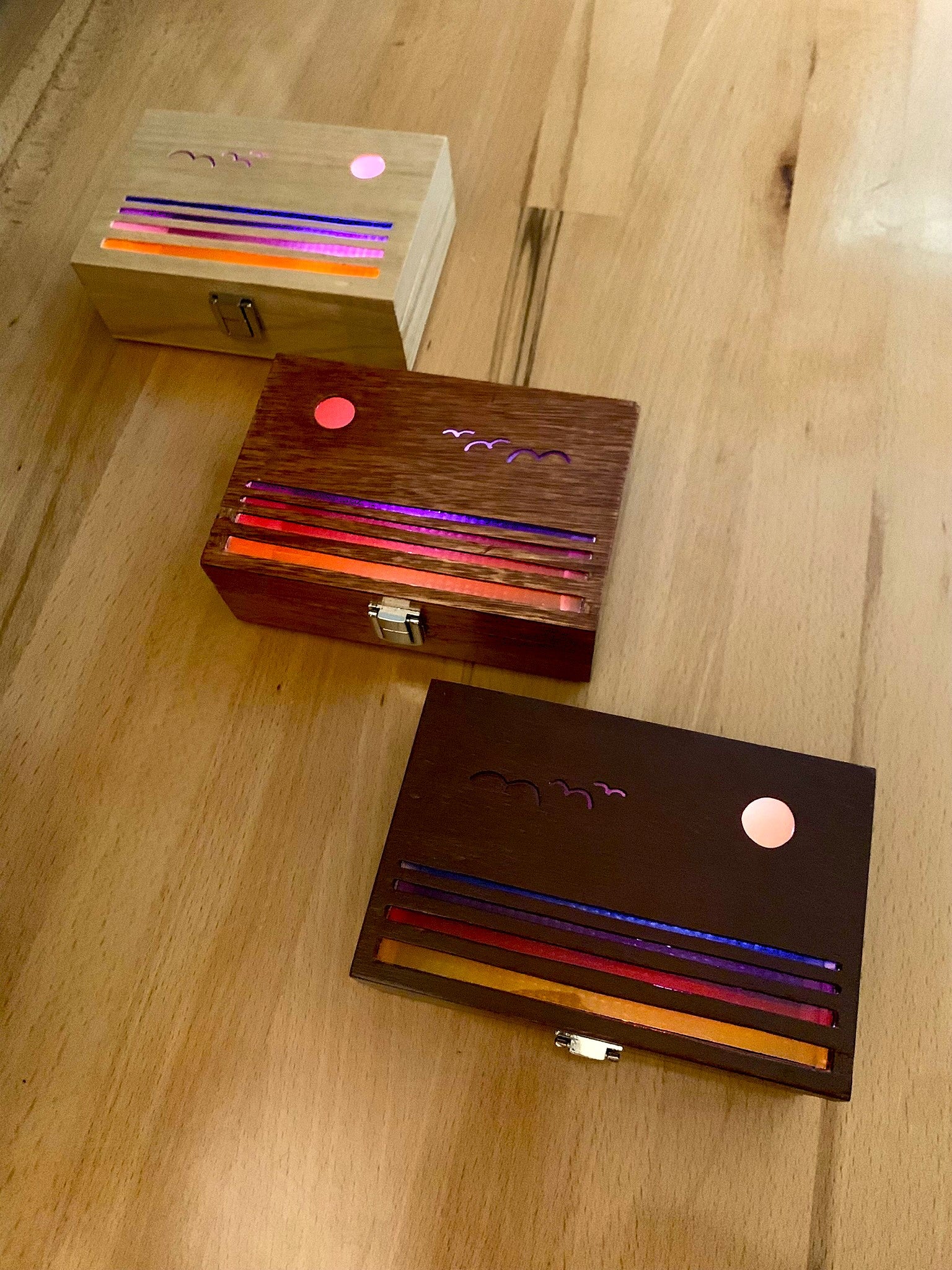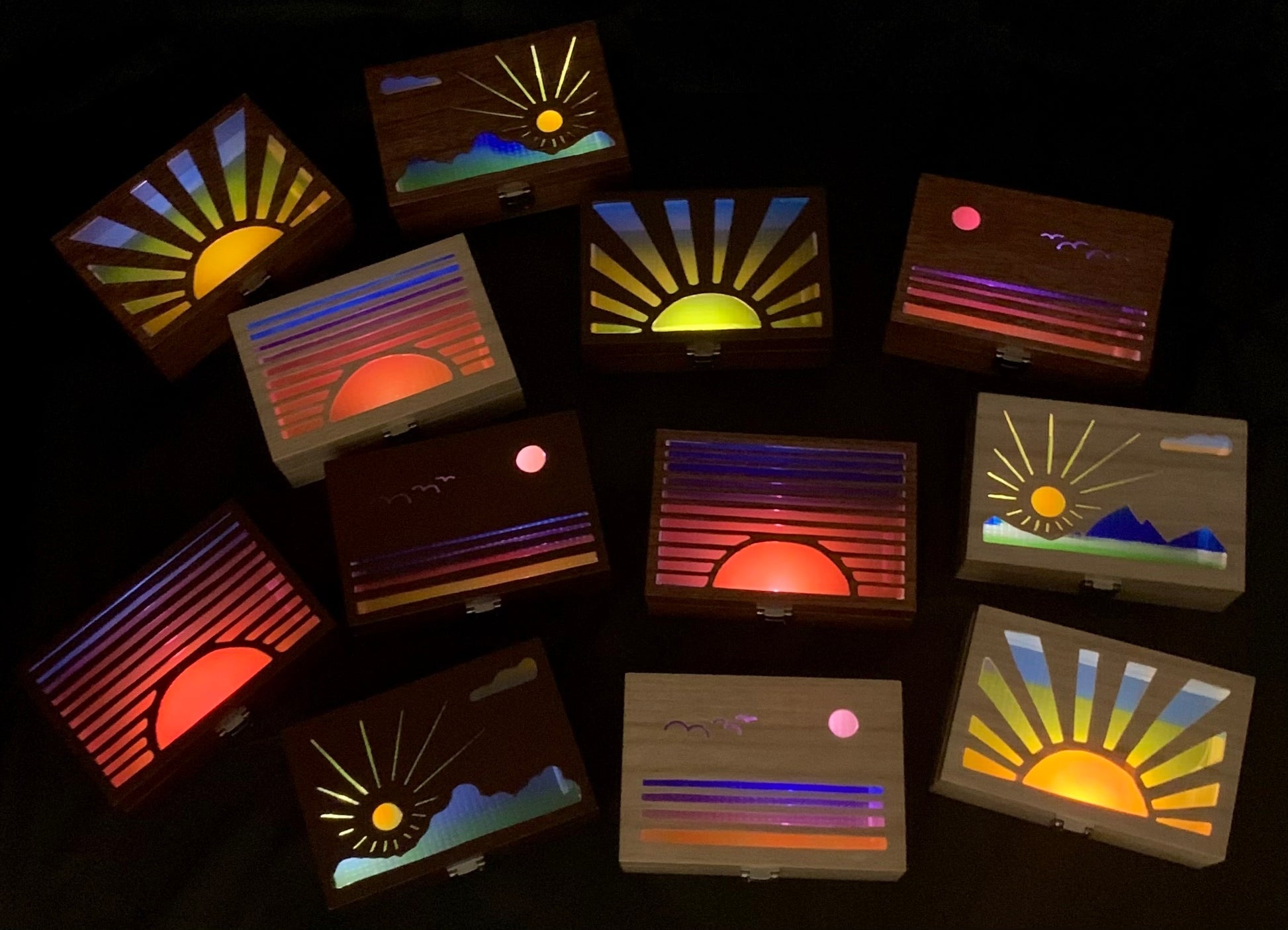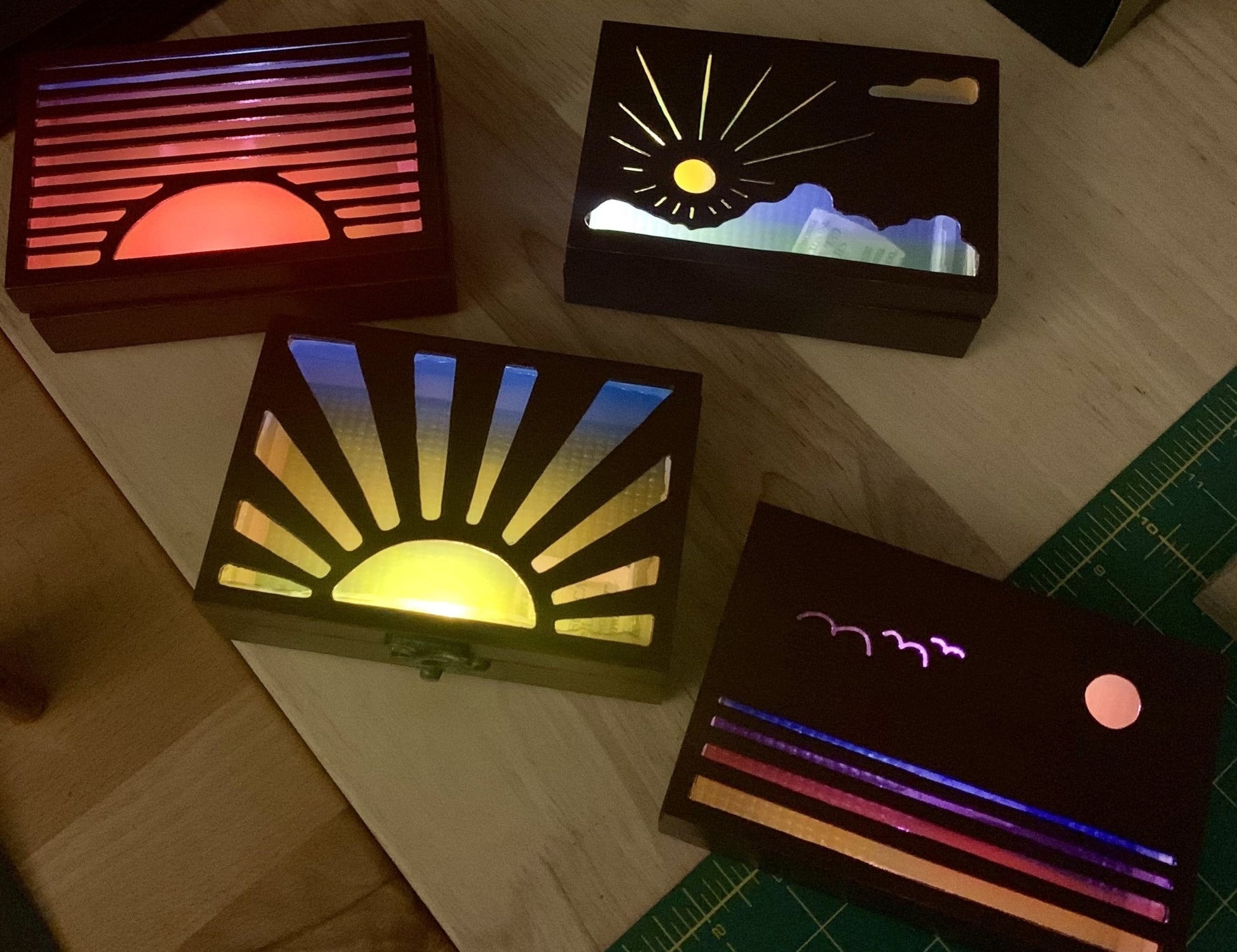 I hand cut each design into these wooden boxes, using the same sunrise and sunset themes from my bookmarks. I wanted to bring the scenes to life with color and light, capturing the mood of each design in a new way. A small LED inside casts a soft glow, powered by a replaceable CR2032 battery that lasts approximately 200+ hours of continuous use.
