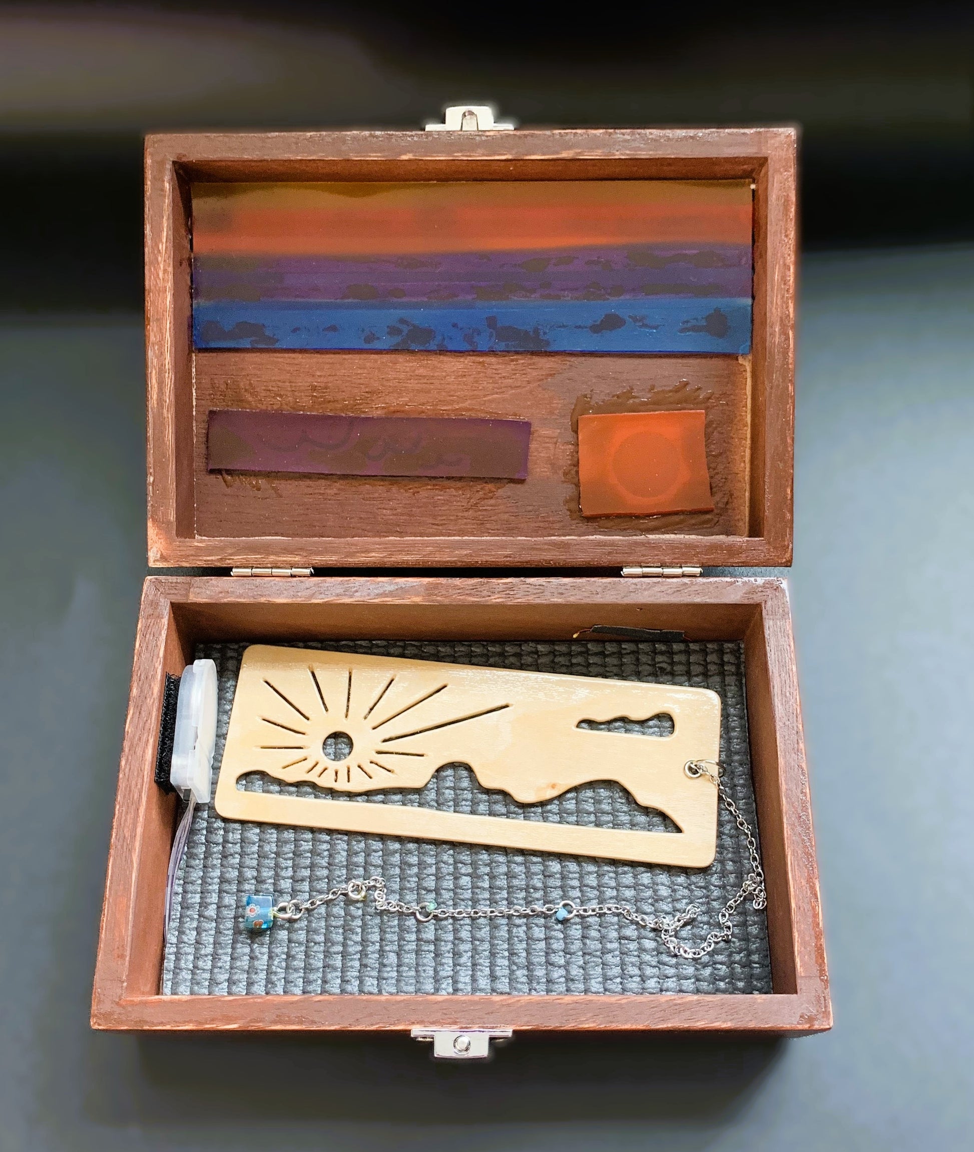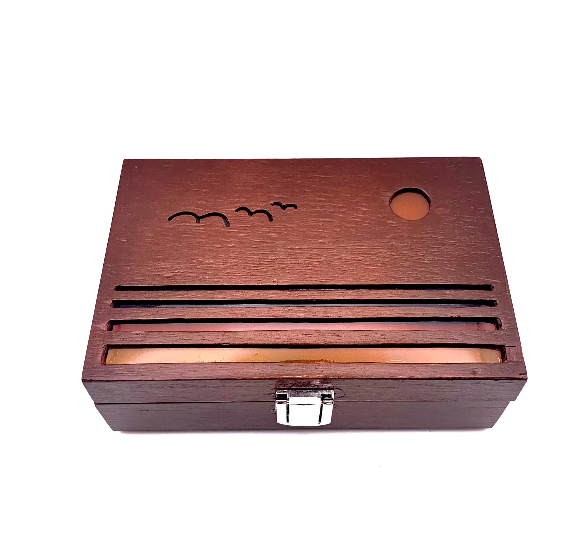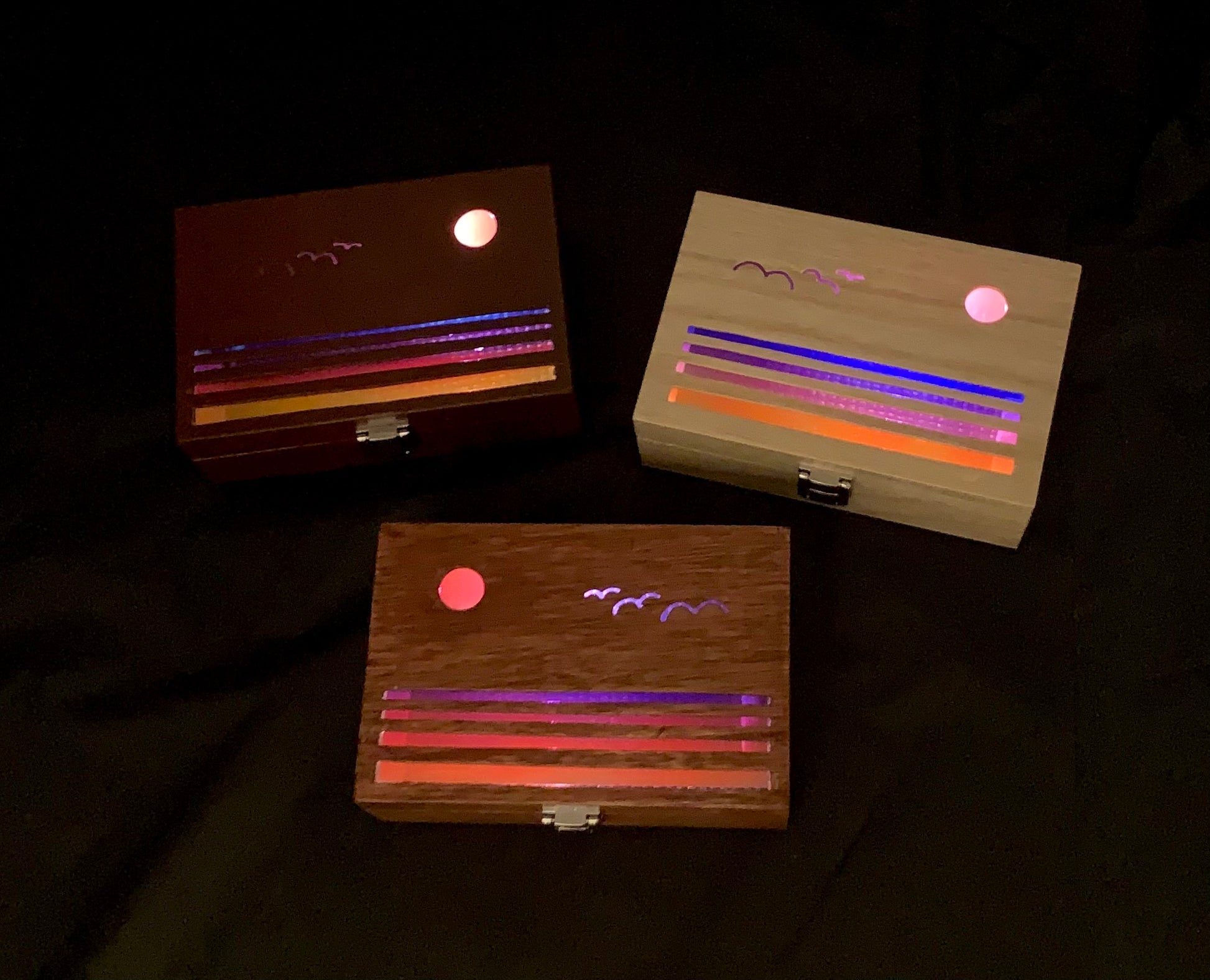 I hand cut each design into these wooden boxes, using the same sunrise and sunset themes from my bookmarks. I wanted to bring the scenes to life with color and light, capturing the mood of each design in a new way. A small LED inside casts a soft glow, powered by a replaceable CR2032 battery that lasts approximately 200+ hours of continuous use.