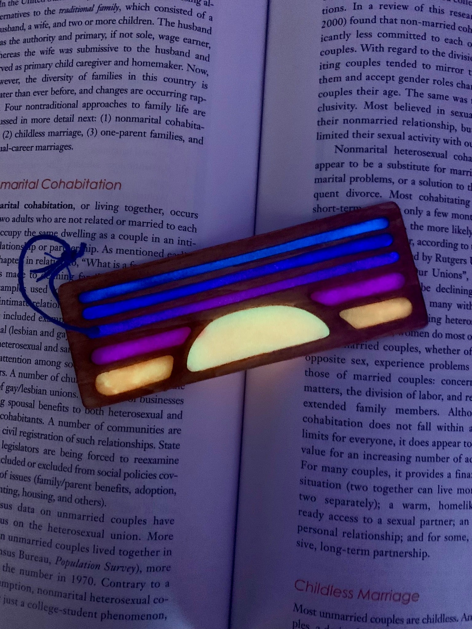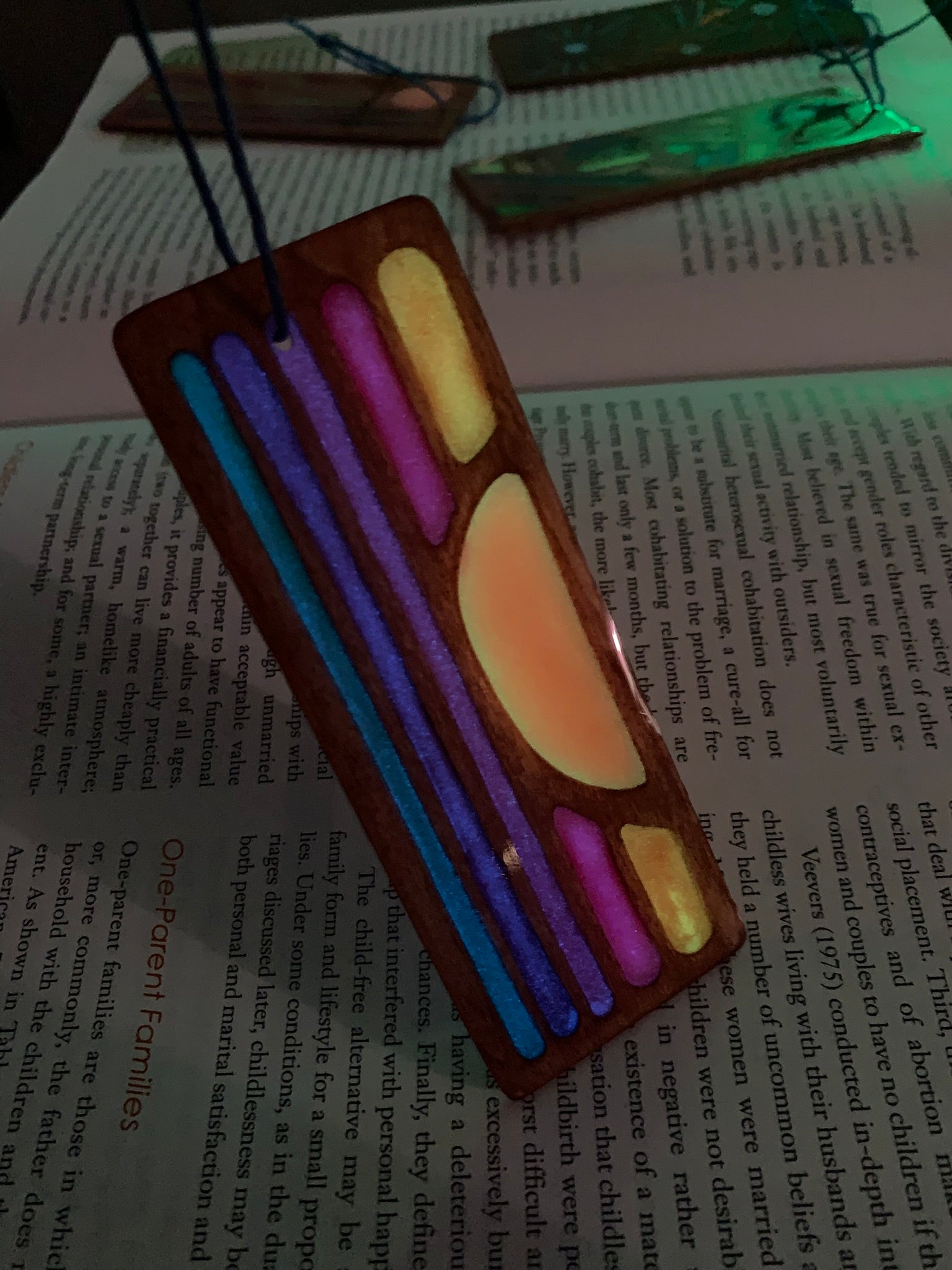A vibrant sunset bookmark that glows in the dark. The glow pigment I sourced was very grainy and difficult to work with, it would not dissolve no matter what directions and/or suggestions I followed. So frustrating. But it glows pretty good! I need to find better glow pigment.