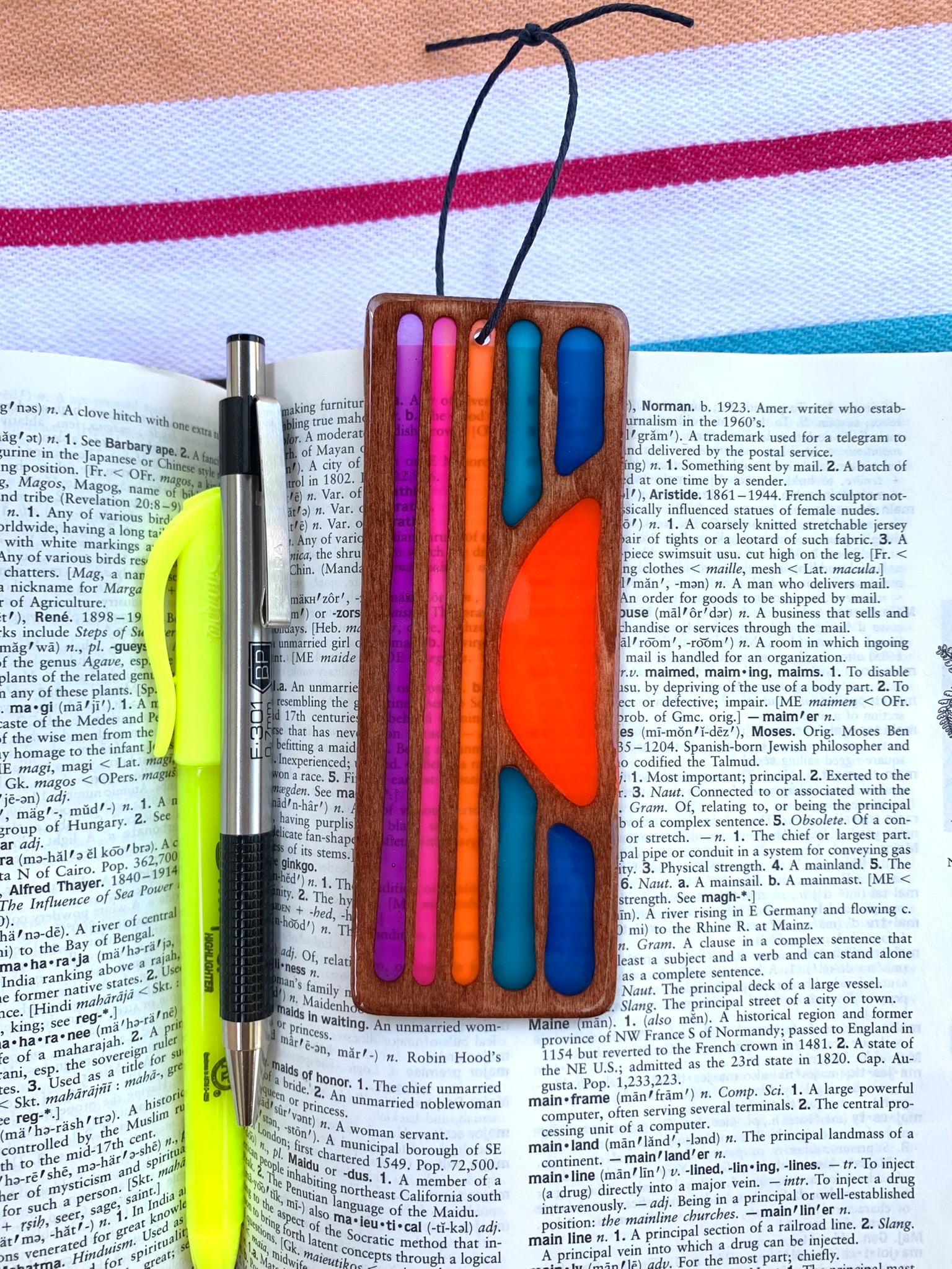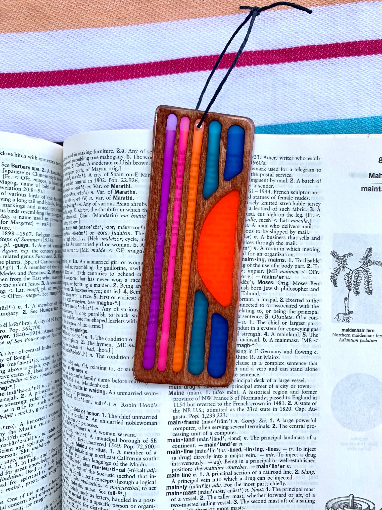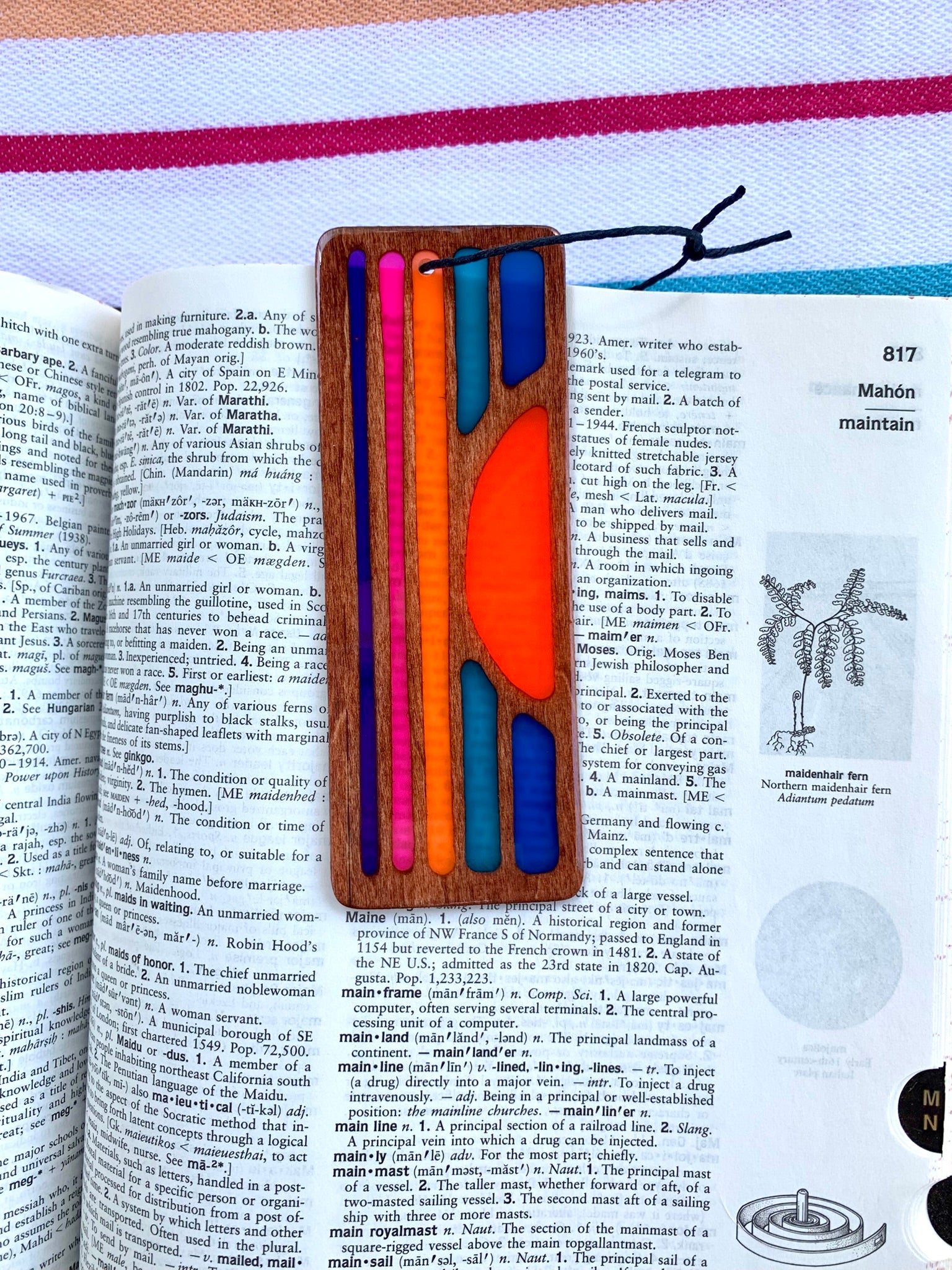 I cut the bookmarks from balsa wood sheets and stain them in different wood tones for a variety of color and grain highlights. I fill the designs with colorful UV resin, then give them a final clear coat of resin so they're extra sleek and robust. They have a simple blue hemp string tassel, leaving you with the option of adding any tassel if you would like.