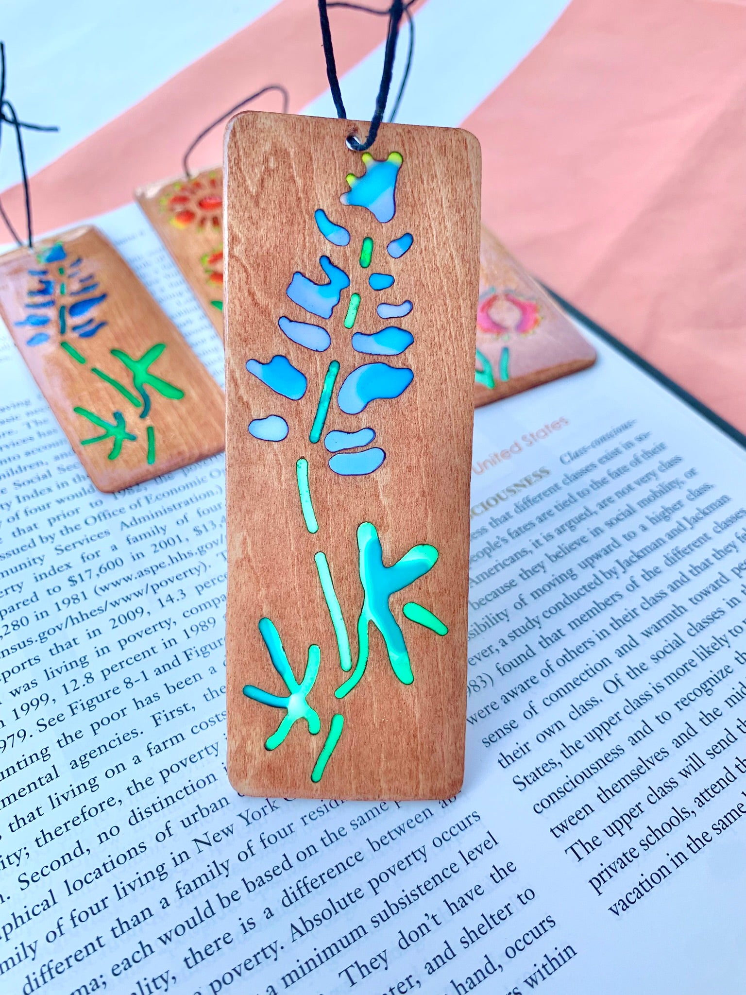 I cut the bookmarks from basswood sheets and stain them in different wood tones for a variety of color and grain highlights. I fill the designs with colorful UV resin, then give them a final clear coat of resin so they're extra sleek and robust. They have a simple blue hemp string tassel, leaving you with the option of adding any tassel if you would like.
